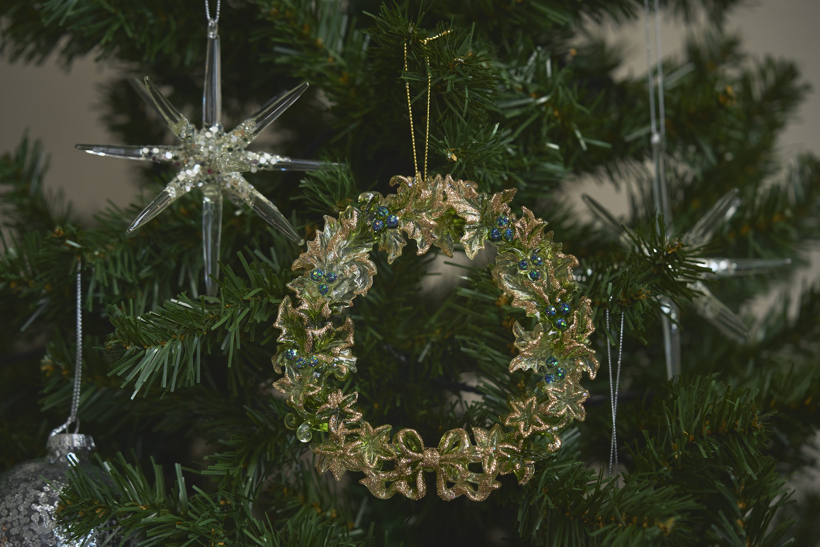 ヒイラギとポインセチアを連ねたかわいいリース型のクリスマスツリーオーナメント。