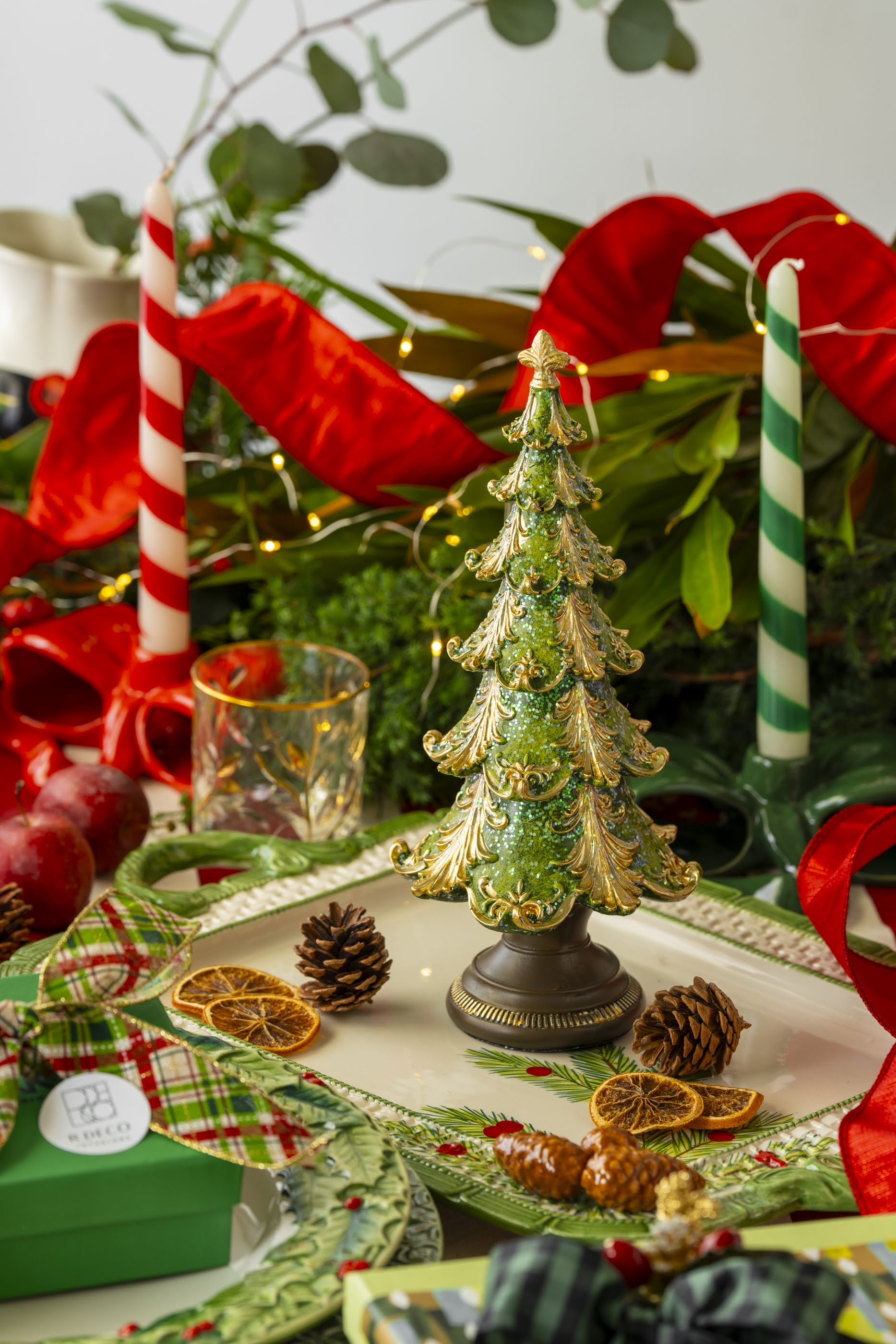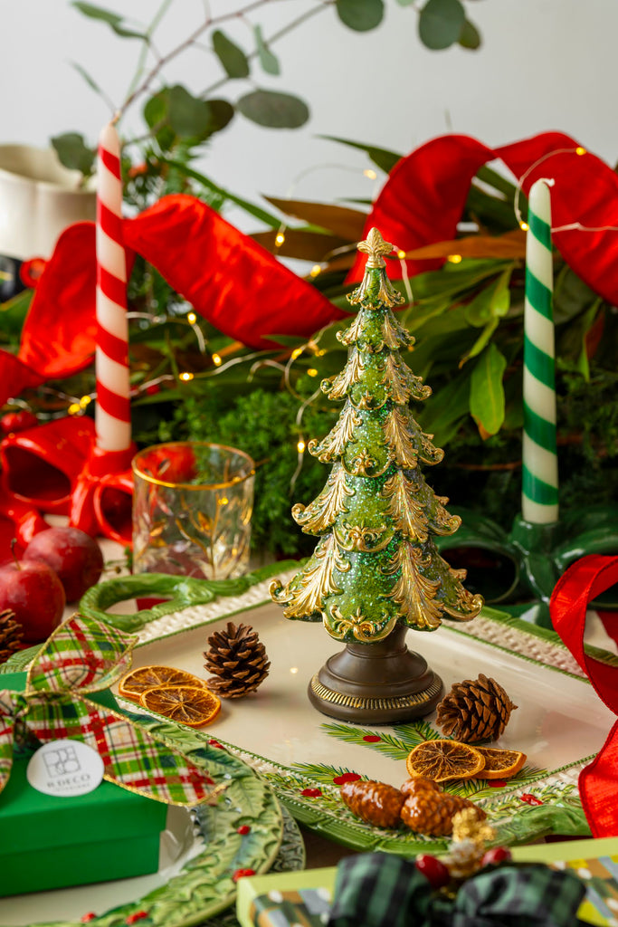 アンティーク調の重厚感のあるグリーンのクリスマスツリーのオブジェ。