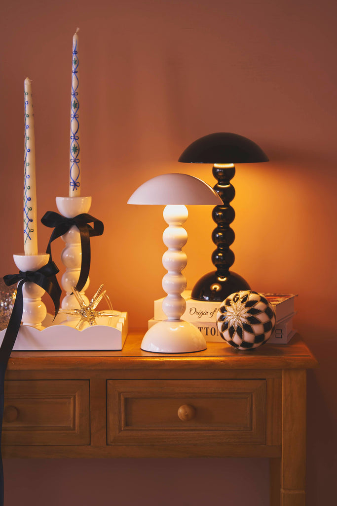 艶やかな発色のラッカー仕上げと、ボビン(丸いビーズ状)の立体的なデザインが魅力のLEDランプ。
