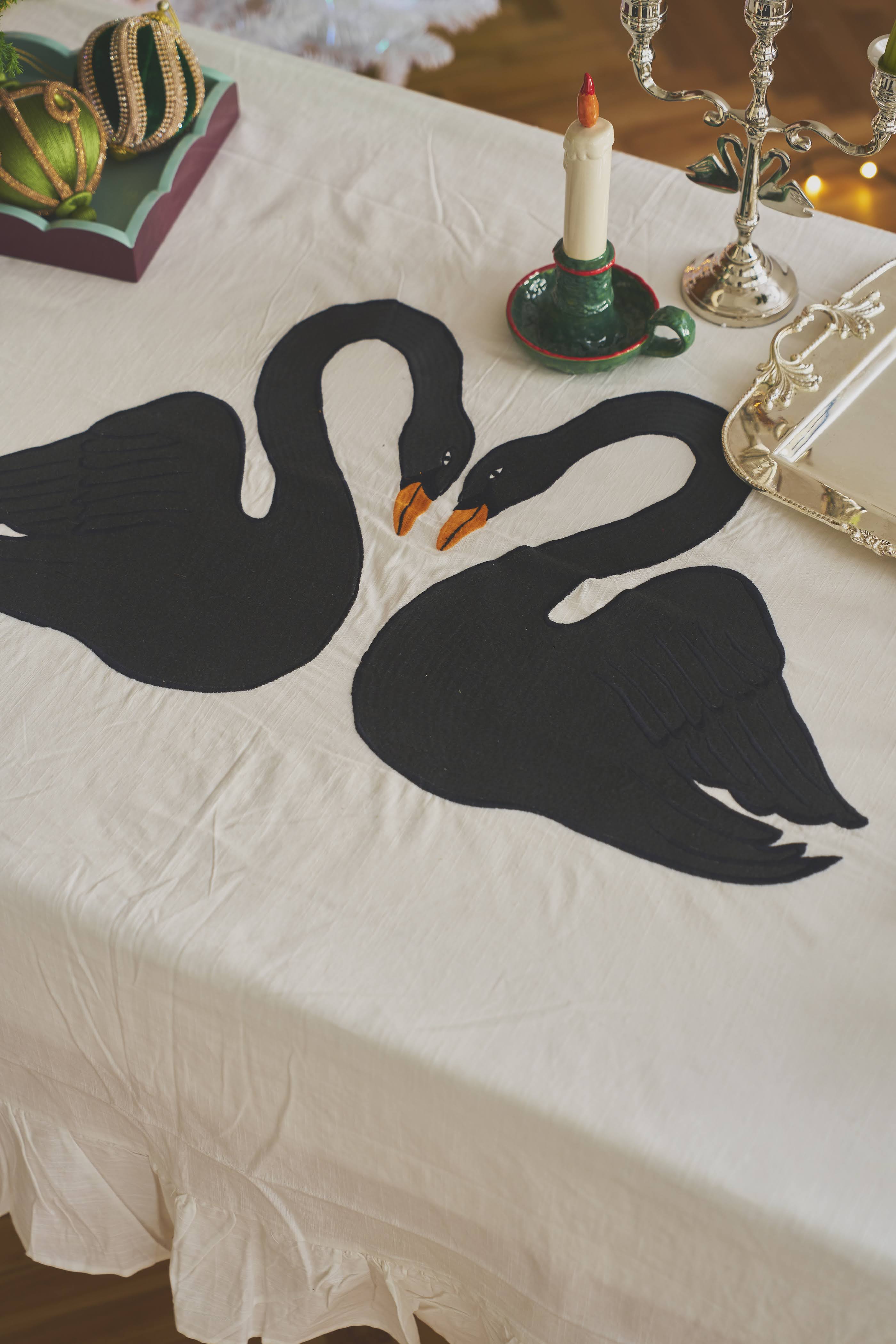 こちらの ブラックスワン テーブルクロス は、中央に寄り添うように向かい合う2羽の黒鳥を刺繍した、ロマンティックで印象的な一枚。