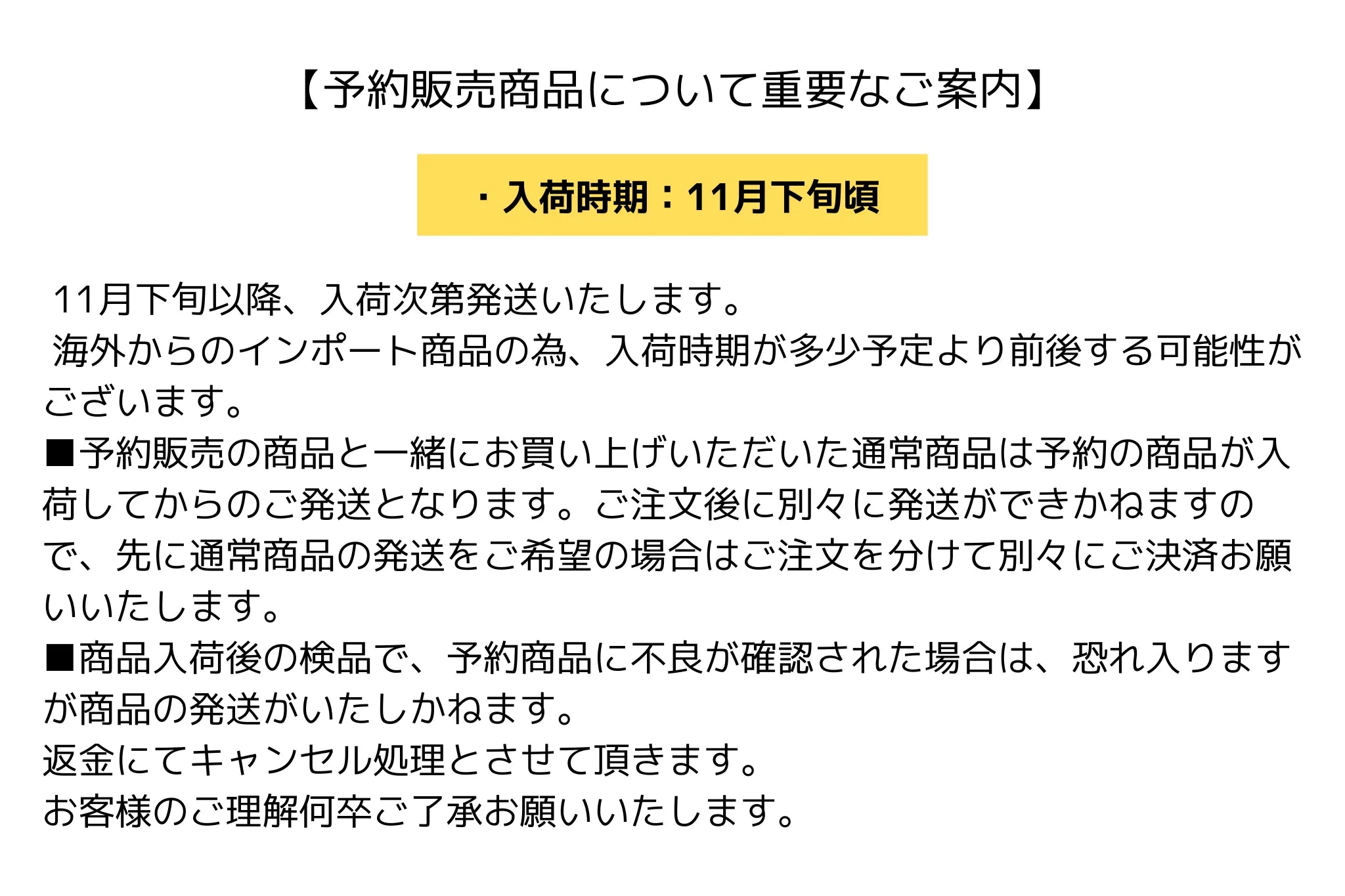 ・商品入荷後の検品で、予約商品に不良が確認された場合は、恐れ入りますが商品の発送がいたしかねます。返金にてキャンセル処理とさせて頂きます。