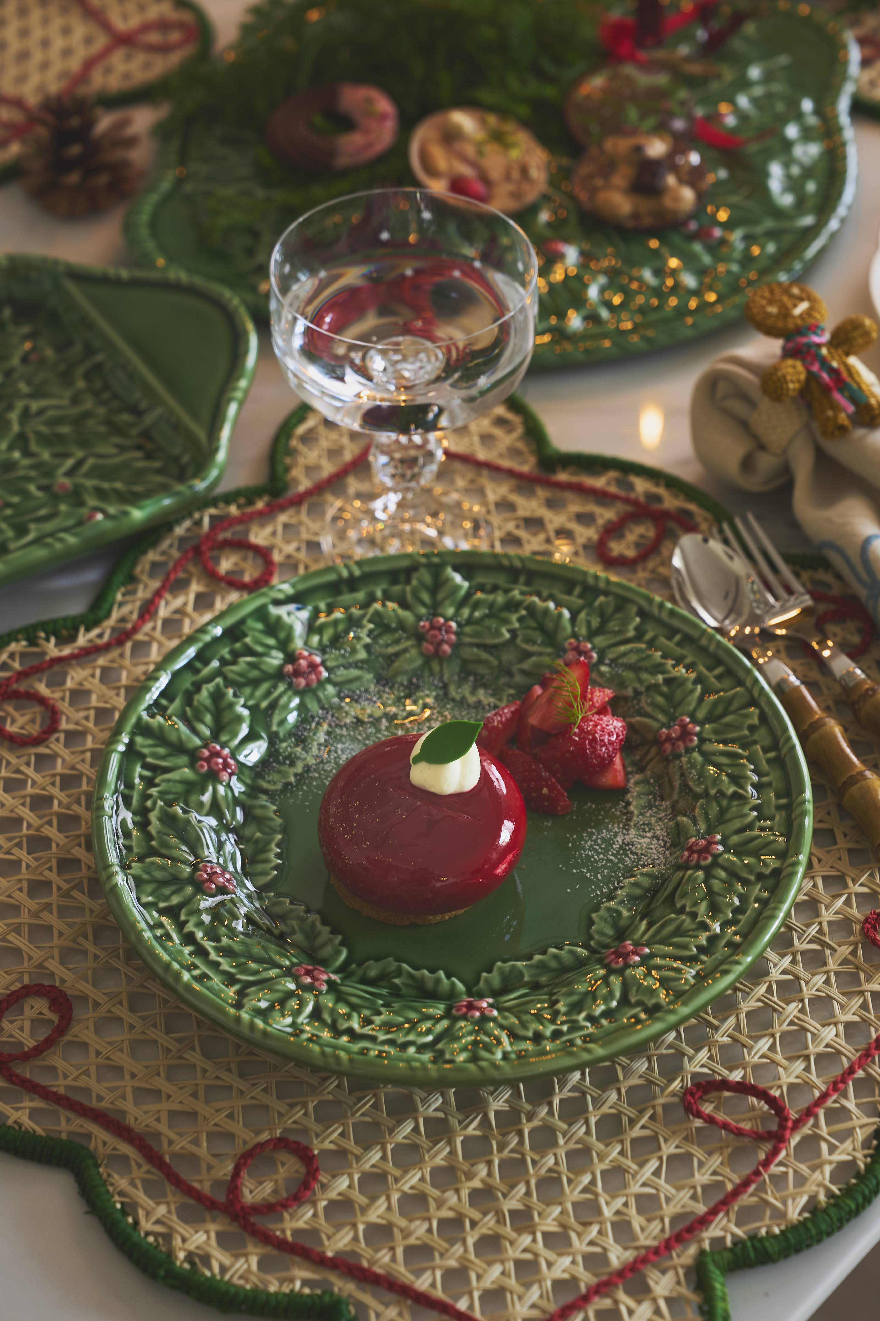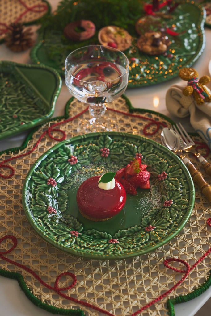 デザートプレートは、縁いっぱいにあしらわれたヒイラギの葉と実が華やかな一枚。