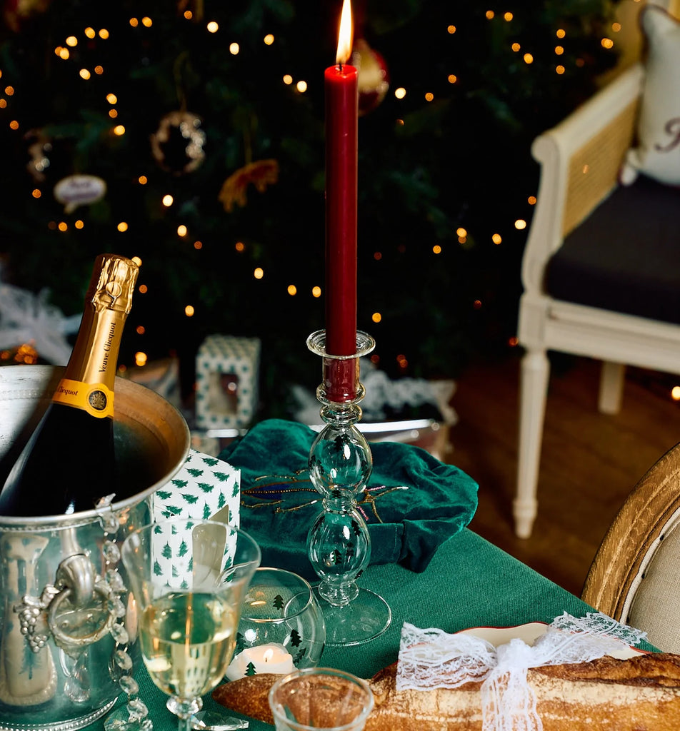 ガラス越しに灯るキャンドルの光がゆらめき、食卓やリビングを優しく包み込むように演出。