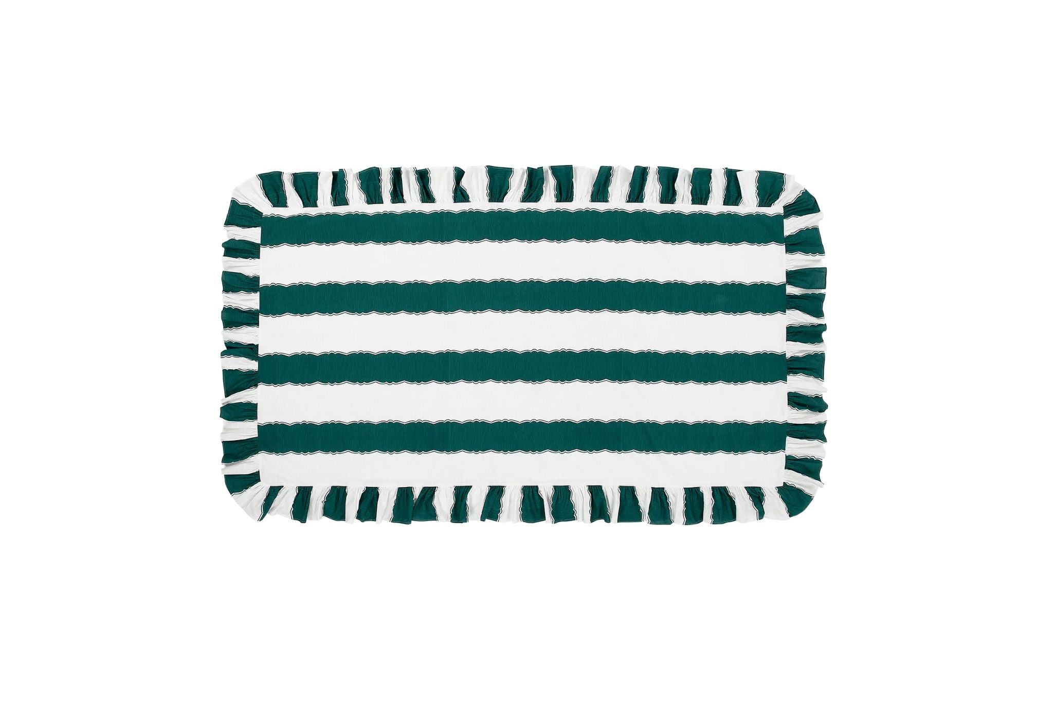 深いグリーンとホワイトのストライプが印象的な「フォレストフリル テーブルクロス」。