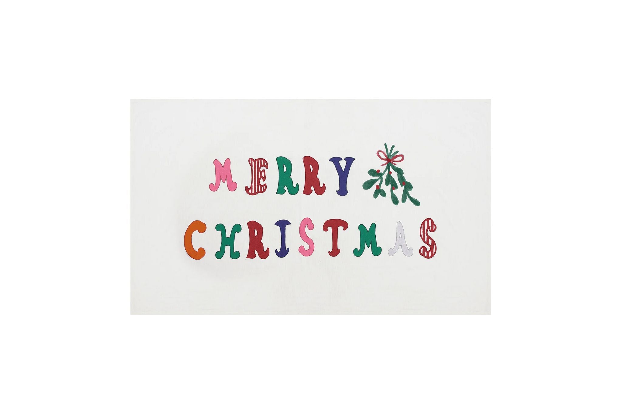 カラフルな文字で“メリークリスマス”が描かれたテーブルクロス。