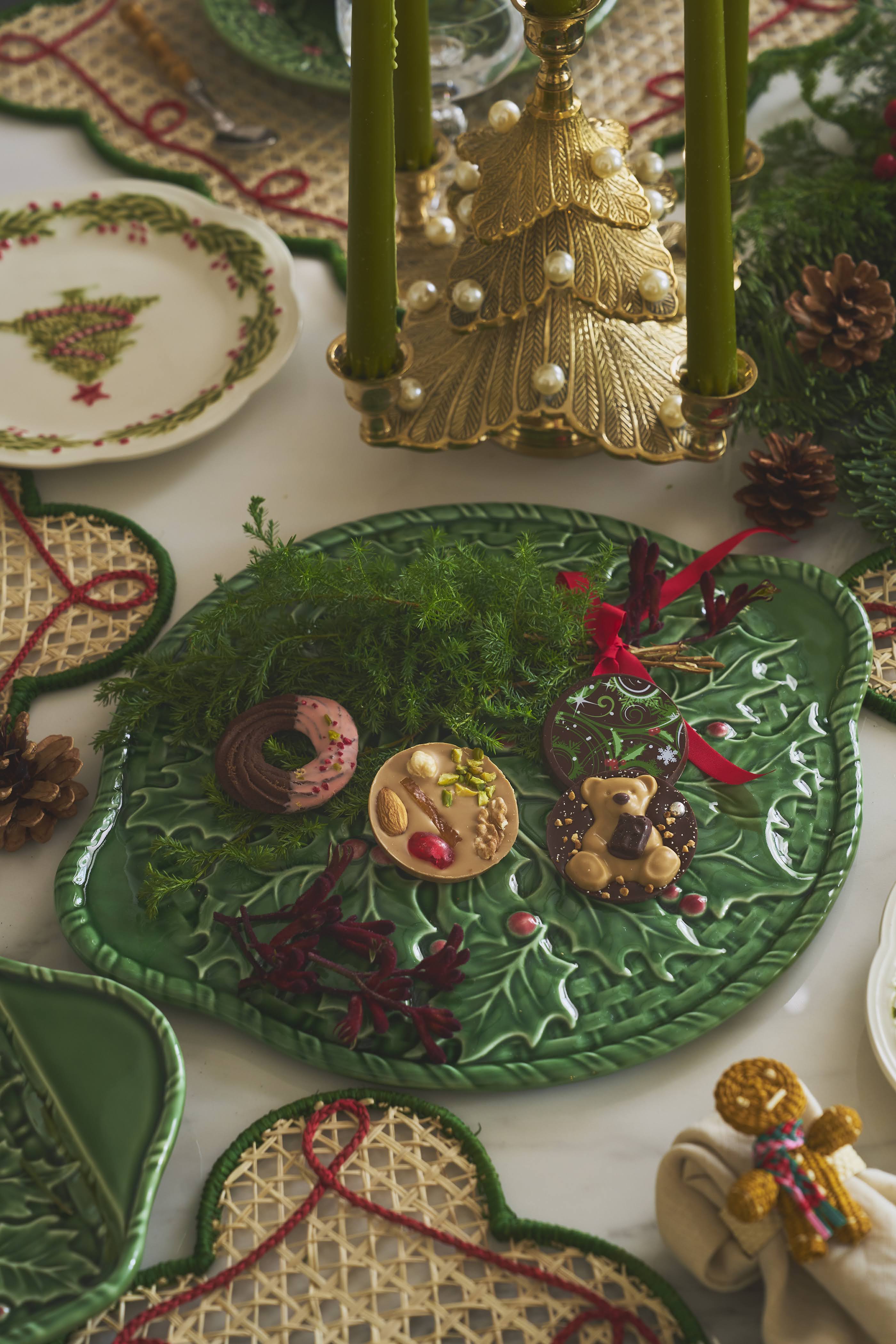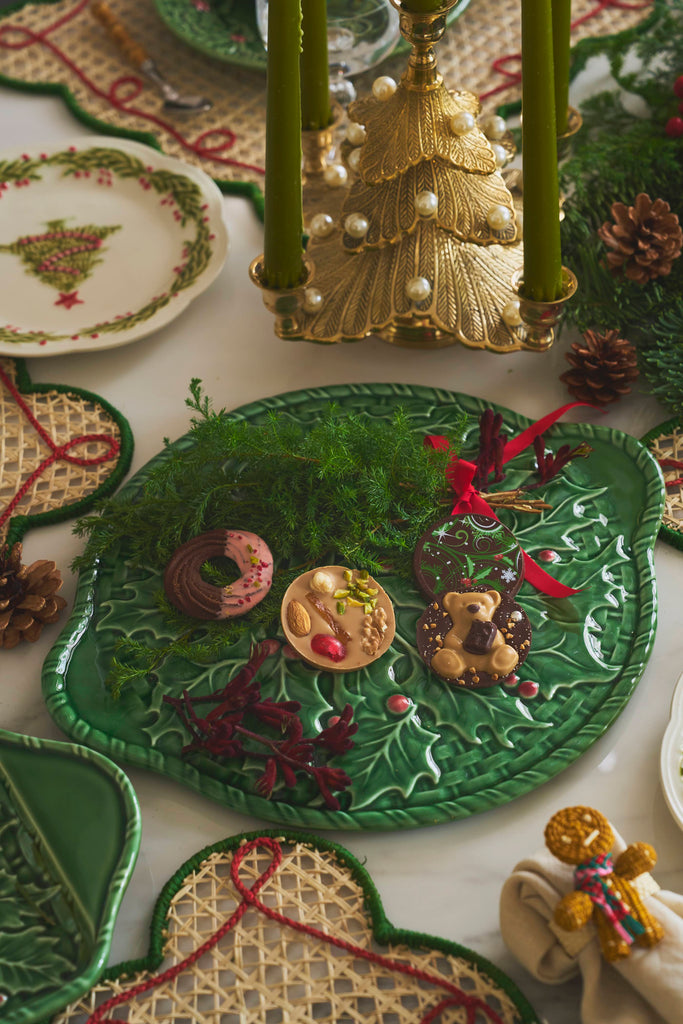 ケーキプレートは、ヒイラギの葉や実を立体的にデザインした装飾と、深みのあるフォレストグリーンが印象的な一枚。
