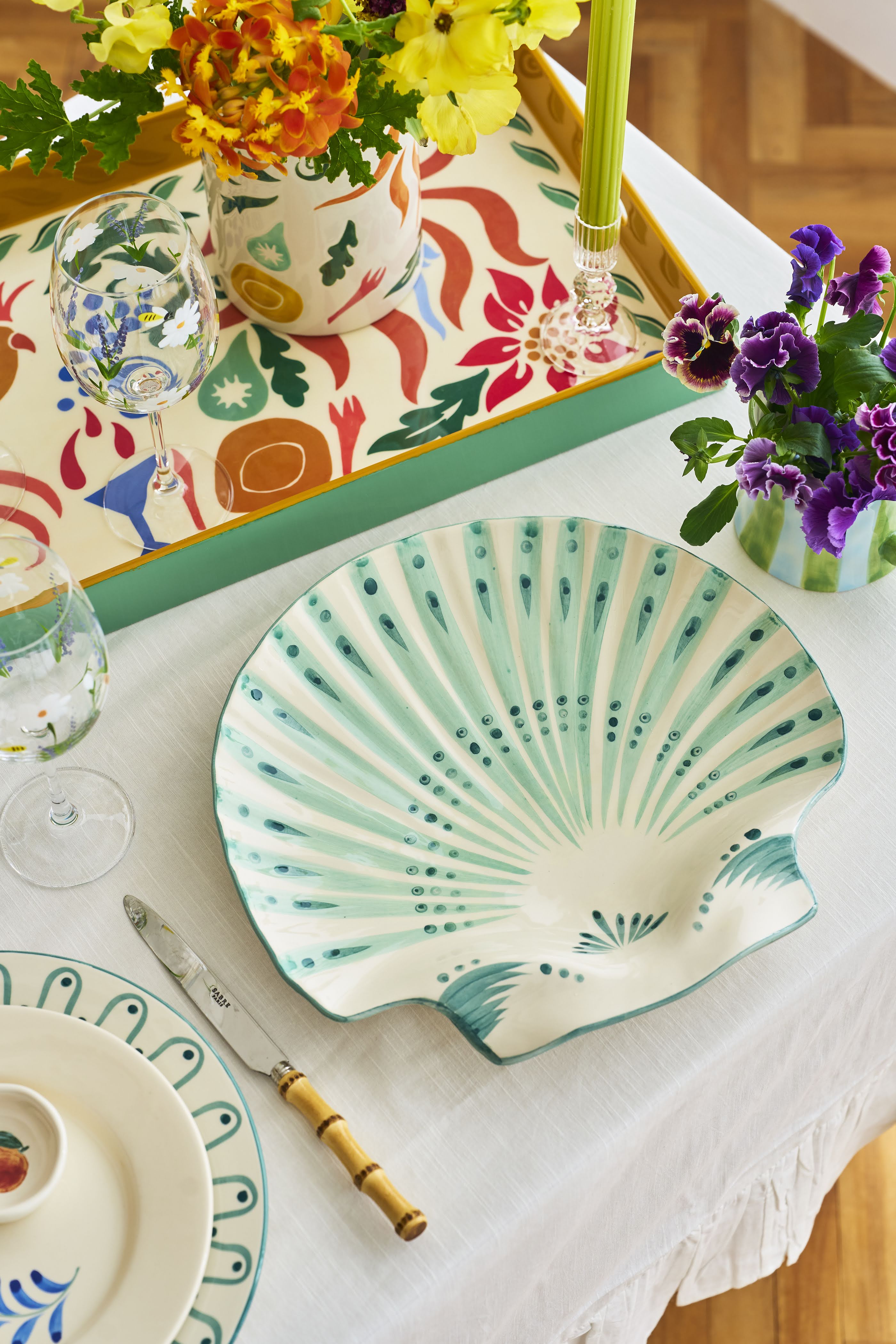 貝殻をモチーフにしたデザインと、やわらかなグリーンの彩りが目を引き、テーブルの主役として存在感を放ちます。
