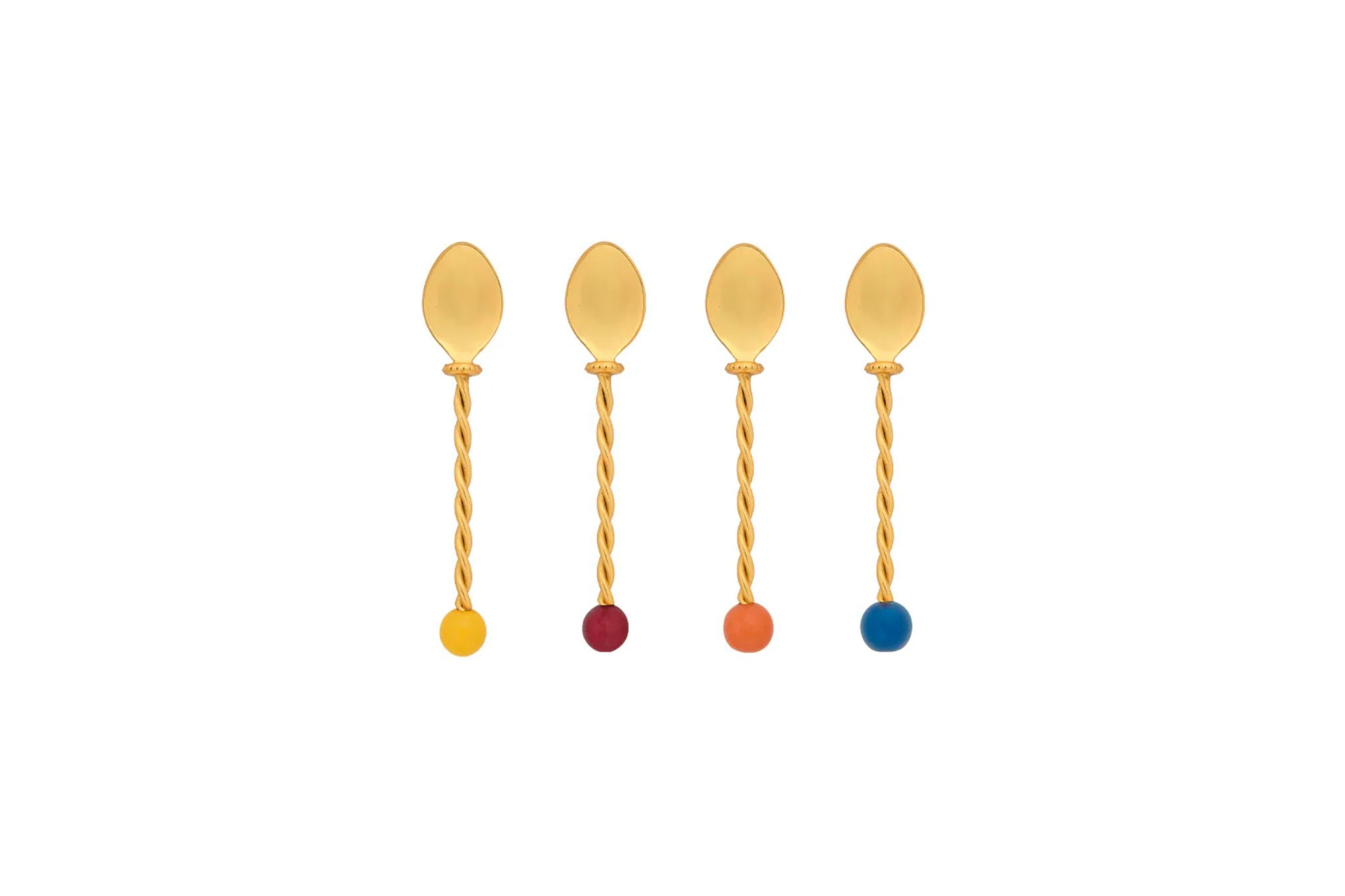ツイストデザインのハンドルと、先端にあしらわれたカラーボールが目を引くデザートスプーンの4本セット。