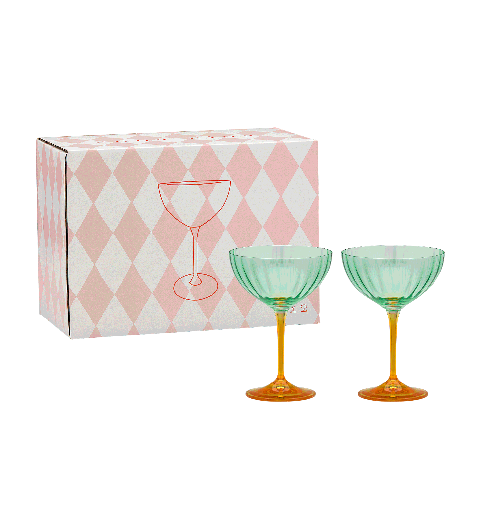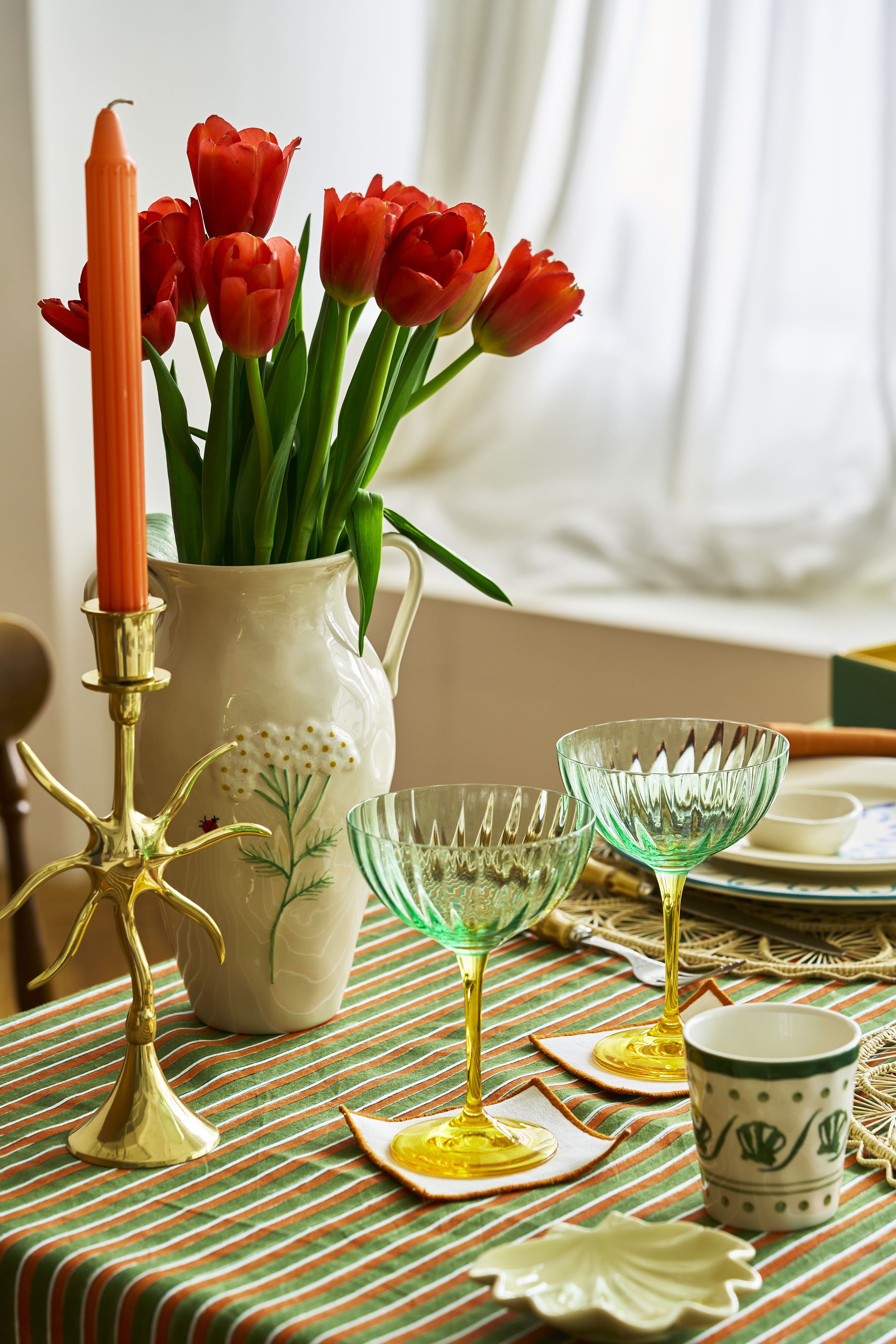 透明感のあるグリーンガラスに、温かみのあるオレンジカラーのステムを組み合わせた、テーブルコーディネートに遊び心を添えるシャンパングラス。