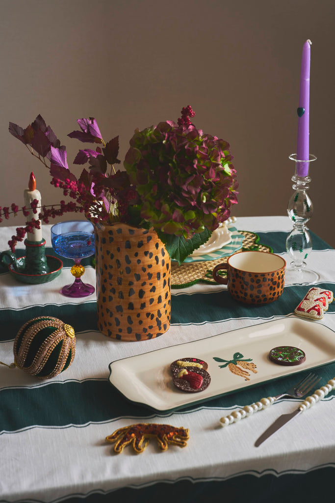 ハンドペイントの陶器やガラス製品、鮮やかなアート作品など、大胆かつ魅力的なテーブルコーディネートに必要なアイテムが揃っており、ホームウェアの他に、ジュエリーやファッションも幅広く取り扱っています。