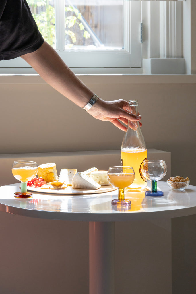 透明なガラスにカラフルなステムとベースが組み合わさり、テーブルにポップなアクセントを添えてくれます。