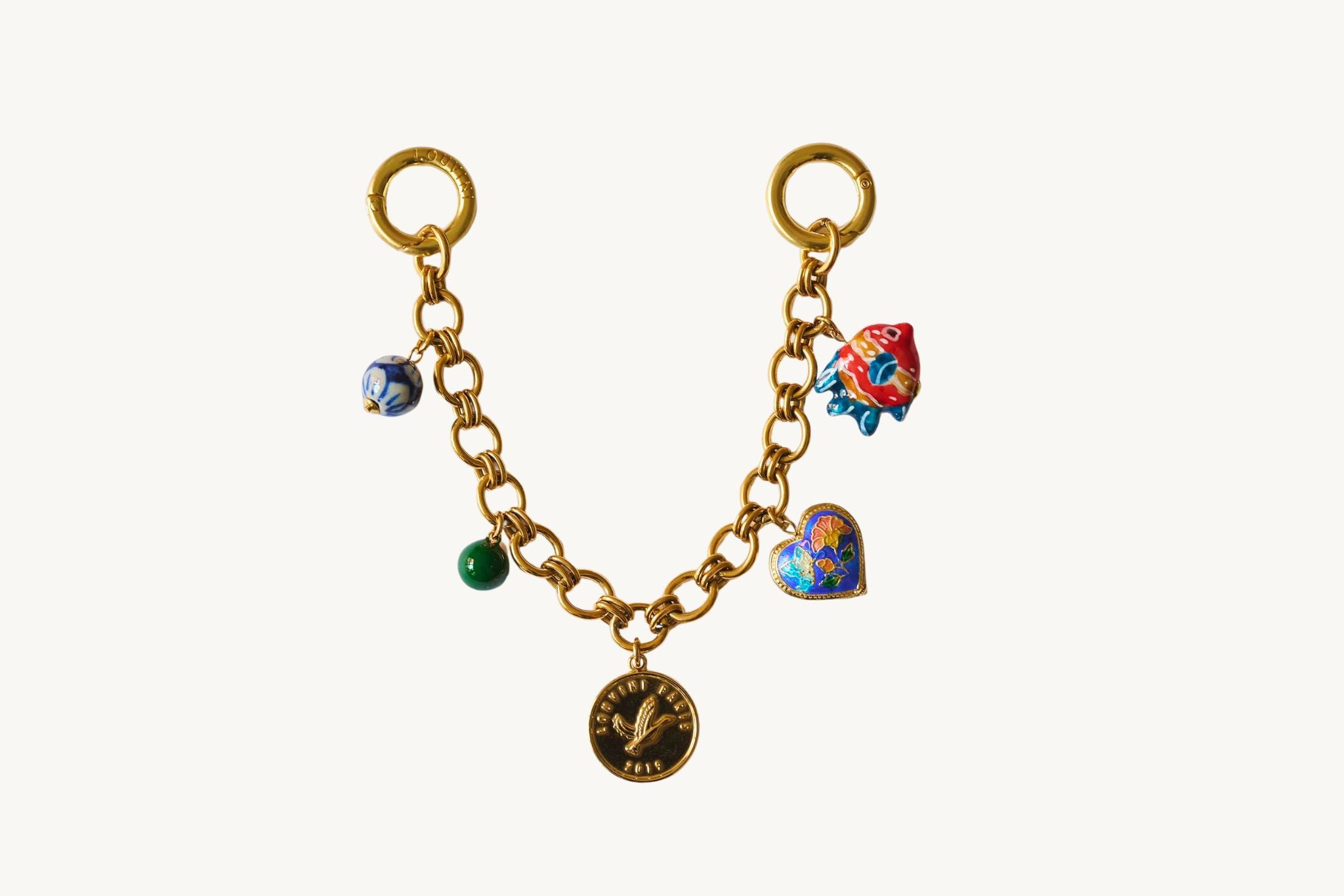 パール、ハート、魚、メダル、スイカの個性あふれる5個のチャームがバランスよく散りばめられた、遊び心とラグジュアリー感を兼ね備えたゴールドストラップです。